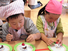 「クリーム、クリーム」「かざりをのせて。」(できあがり)「おいしいね。」