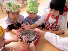 「こな、こな、ちいさくなるね。」「いいにおいがしているよ。」「よくまぜるからね。」