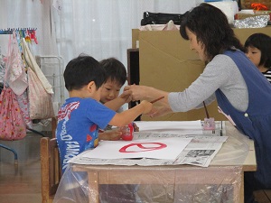 お部屋の中では絵の具で表現遊び、筆の使い方を丁寧に