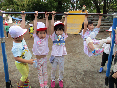 かくれんぼは、「忍法隠れ身の術」を使って修行しています。木っ端で、飛び石を作り、飛んだり、バランスをとって動いたり、自分たちでコースを考えて作り、日々修行する子ども達。なりきって遊ぶこと、仲間との一体感を味わっています。