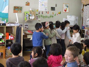 3学期になってから、身近なお話で劇あそびを続けてきたきりん組、今日は他の組の子どもたちを誘って劇の会を開きました