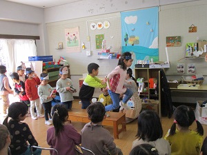 年中組は先生とのやり取りでお話が進められることも多いですが、自分たちでもやる気になっていろいろな役を楽しんでいます