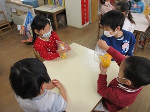 年少組が学園内にお散歩で出かけたときに夏みかんを収穫し、それぞれのクラスで美味しいものを作りました