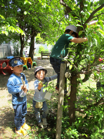 虫網を持って園庭で虫探し。見つけた虫は肩に下げている本に描き足しています。この日は蝶の幼虫が木の上にいるのを発見し、木登りにも挑戦しました!
