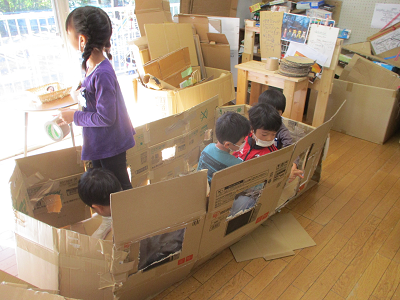 最初は、箱にテープをはって「電車」としていたのが、だんだんこだわりが生まれていき、車は「長方形」ではないということも表現したくなります。そうすると、『既存の箱』では表現できない事に気づいていきます。すると、どうするか。子どもたちは、箱や紙を切り、それを再構成し、作っていきます。