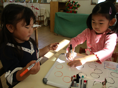 磁石の丸型を使ってきれいなまるが描けることに気がつきました。子どもにとっては大発見!