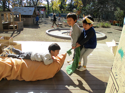 11月の誕生会で「3匹のやぎのがらがらどん」を見た子どもたち。透明のチューブを見つけたかと思ったら突然、そのチューブを頭に乗せて「がらがらどん」と橋を渡り、お話がはじまりました。素材を見つけてイメージが沸き、がらがらどんになりきっている子どもたちです。