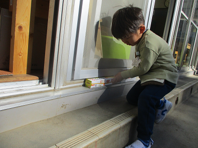 こどもがつくる世界の後、年長さんの動物園でイルカとあそんだことがきっかけとなり「イルカをつくる」と保育者と一緒に素材を選びながらつくりました。できあがると早速、イルカを手に・・・でかけた先は“動物園”「おんなじ」と見せながら、仲間に入れてもらいました。異年齢のしていることに興味を持ち、「やってみようとする」姿がでてきました。