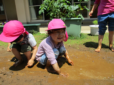 「つめたい!」「どろどろって気持ちい~」と手と足で泥の感触を感じていました。