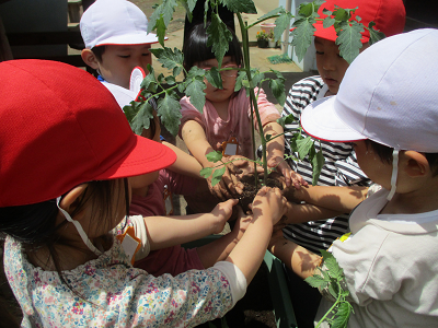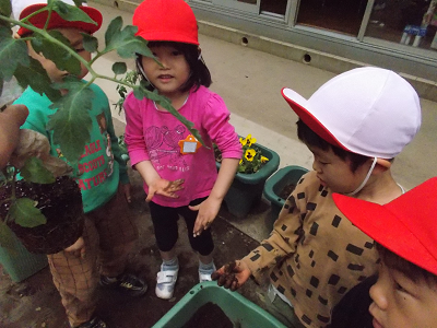 ミニトマトの苗を植えました。「早く食べたい!」「何色になるかな」と楽しみにしています。水やりをしたり、「トマト増えてる!」「大きくなってるよ」と、変化を見ながら気付いたことを呟いている子どもたちです。