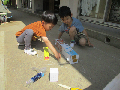 テラスに線路を描き、それぞれの作った電車を走らせています。積み木で信号や駅を作ったり、日によっていろいろな線路が描かれていて面白いです。