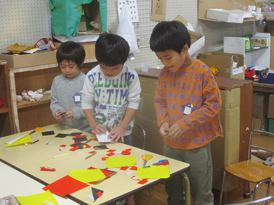 年長の子どもたちは、自分の体験をもとに遊びを深めています。見聞きした体験を自分たちなりに脚色したり、再現しようとしたり、独自色を強めたりしています。遊びにおいて、子どもたちなりに「本物らしさ」を追究しているようです。自分たちの技術の限界に挑戦しつつ、おとなをうならせる「本物ぶり」がそこにあります。