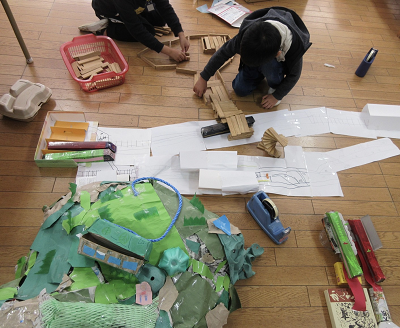 カプラで線路や基地を作り新幹線を走らせていました。けれども「取っておこうとしても、すぐ壊れちゃうよ」と言います。そこで、今は紙や箱を使って作り繋げています。
